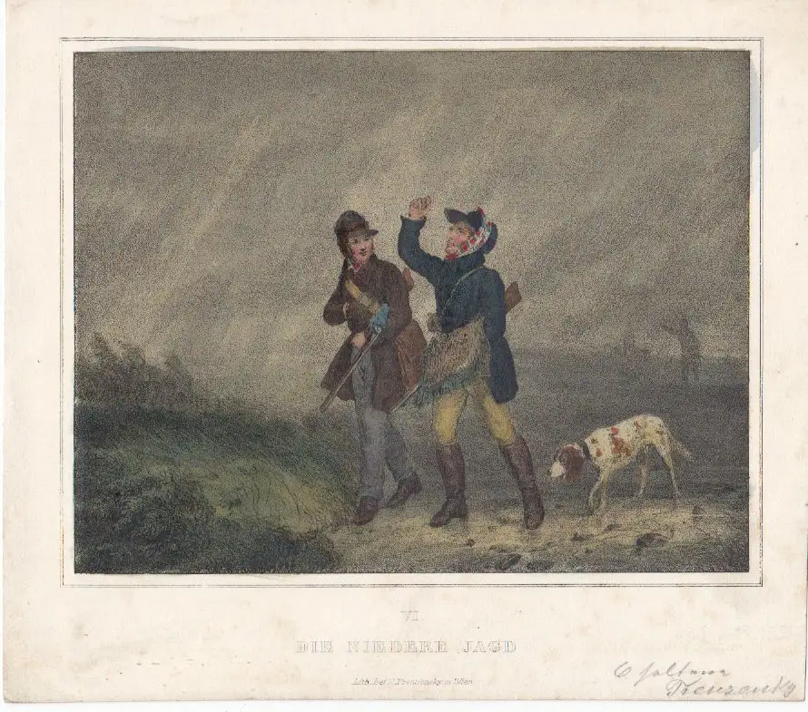 Bemerkungen: Im Vordergrund zwei Jäger mit Hund. Es ist feucht und kalt, vermutlich Herbst. Im Hintergrund die in Regen oder Nebel verschwimmenden Umrisse eines weiteren Mannes.