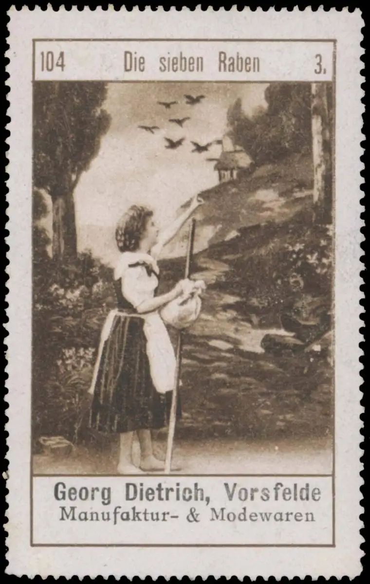 Serie 104, Bild 3, Märchen, Wolfsburg, Manufaktur- & Modewaren, Größe/Zustand: 7x4 , guter Zustand, Original alte Reklamemarke die seinerzeit für die Werbung benutzt wurde