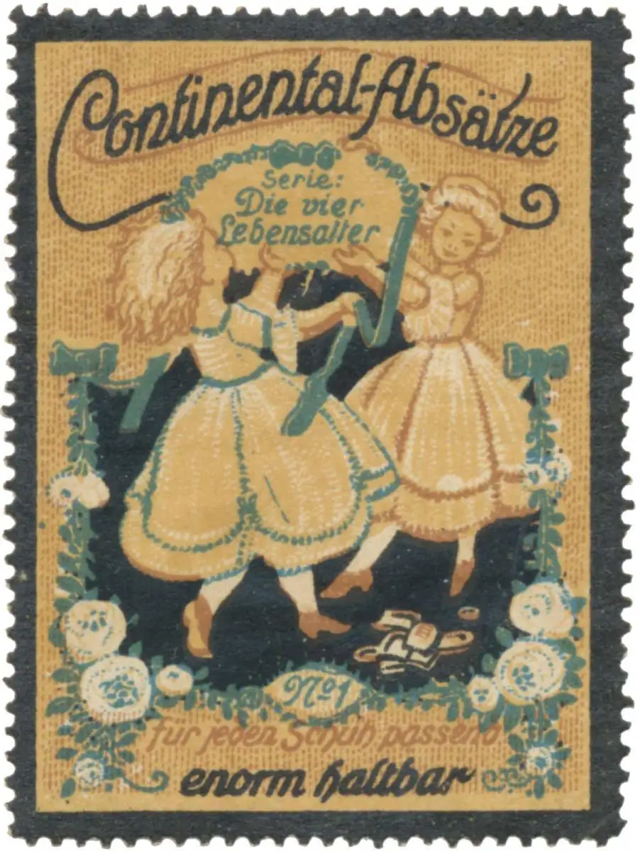 Kindheit, 1, Continental-Absätze für jeden Schuh passend, enorm haltbar, Größe/Zustand: 6x4 , guter Zustand, Original alte Reklamemarke die seinerzeit für die Werbung benutzt wurde
