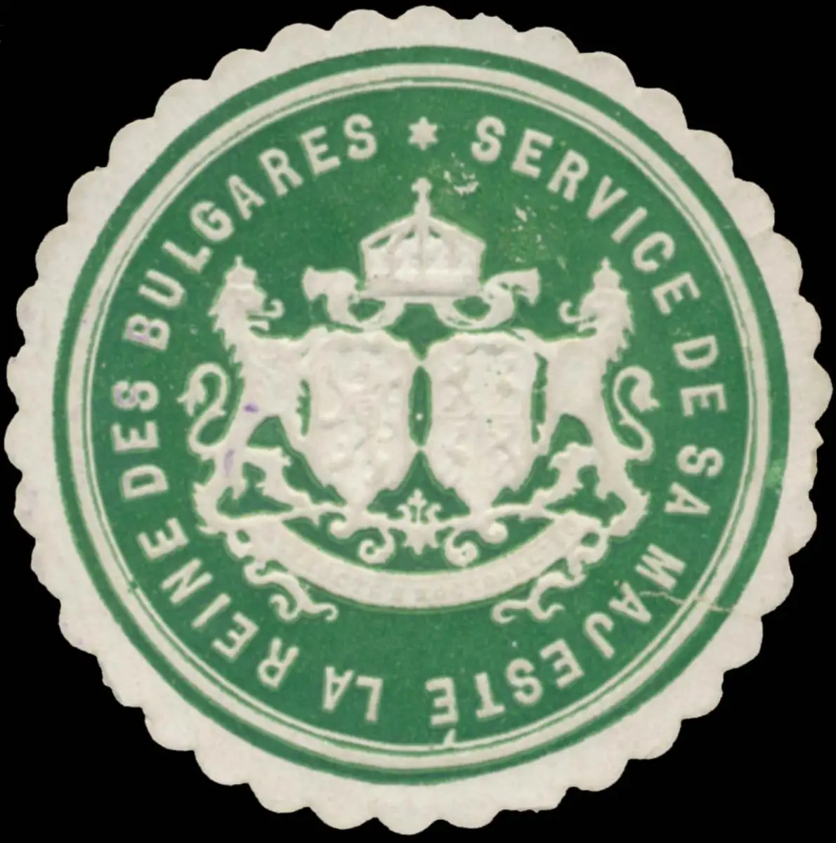 Service de sa majeste la reine des bulgares, Adel, grün, weiß, geprägt, Größe/Zustand: 4 , guter Zustand, Original Verschluss-Siegelmarke aus Papier welche früher von Behörden, Firmen etc. zum Versiegeln der Briefe benutzt wurden