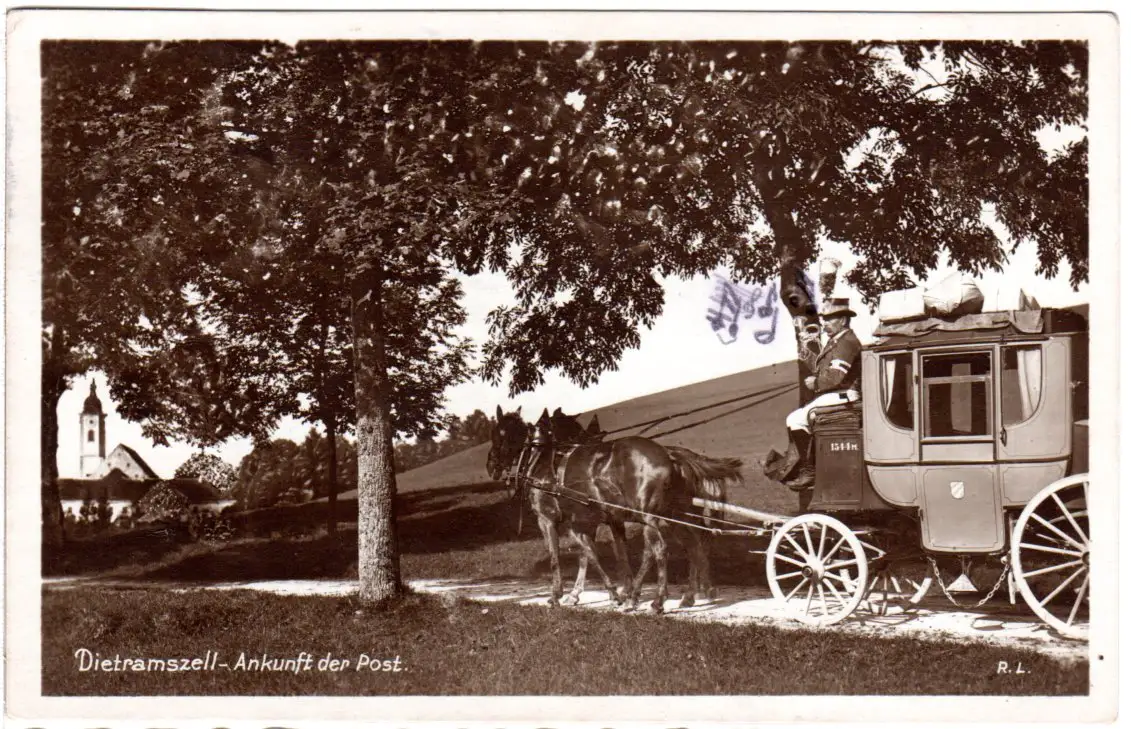 Dietramszell, Ankunft der Post m. Postkutsche, 1931 gebr. sw-AK