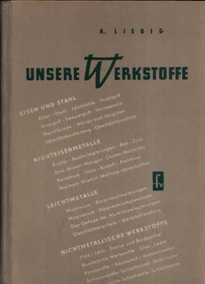 Unsere Werkstoffe; Dipl. -Ing. Liebig, K.; Fachschulbuch; Eisen und Stahl; Eisen; Stahl; Edelstähle; Stahlguß; Grauguß; Temperguß; Hartmetalle; Systematische Benennung von Eisen und Stahl; Stoffnummern; Metallkunde; Härten und Vergüten; Oberflächenhärtung; Oberflächenschutz; Pulvermetallurgie; Nichteisenmetalle; Kupfer; Kupferlegierungen; Blei; Zinn; Zink; Nickel; Mangan; Chrom; Molybdän; Vanadium; Titan; Uran; Kobalt; Kadmium; Antimon; Wismut; Wolfram; Quecksilber; Edelmetalle; Seltenere Metalle; Lagermetalle; Lötlegierungen; Halbmetall Silizium; Leichtmetalle; Aluminium; Magnesium; Andere Leichtmetalle; Oberflächenschutz; Werkstoffprüfung; Nichtmetallische Werkstoffe; Holz; Leim; Steine und Bindemittel; Keramik; Glas; Leder; Kunststoff; Gummi; Anstrichmittel; Schmierstoffe; Schleifmittel; Übersicht über die wichtigsten Elemente