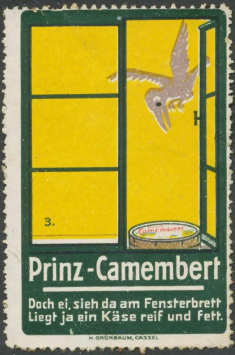 liegt ja ein Käse reif und Fett. Rabe, Bild 3, Druck: H. Grünbaum, Kassel, Größe/Zustand: 6x4 , leicht fleckig, Original alte Reklamemarke die seinerzeit für die Werbung benutzt wurde