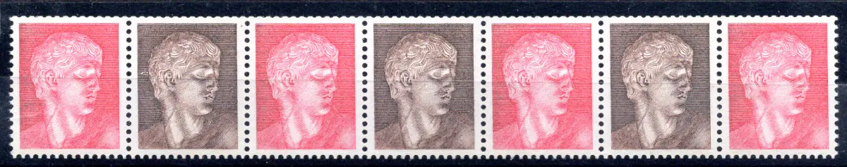 Donatello-Büste - Prüfungen für Verteilerautomaten - Farbwechsel rot + braun Vollgummi - Donatello-Büste - Briefmarkenprüfungen für Verteilerautomaten - 7-fach waagerechter Streifen mit roter Farbwechselvignette + brauner Kammverzahnung (Kat. Sass. spec. Nr. P 94) - Selten - Kat. 900+ Code 687/8