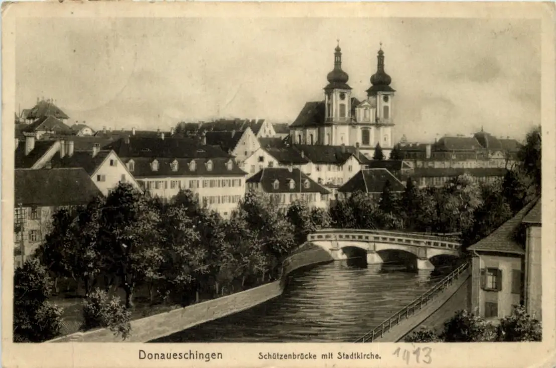 Donaueschingen, Schützenbrücke mit Stadtkirche -520838