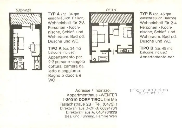 Dorf_Tirol Appartmenthaus Wenter Dorf_Tirol postalisch nicht gelaufen nach 1965 Werbekarte (keine Postkarte) Erhaltung siehe scans [FriedD77] Werbekarte (keine Postkarte) Frierer