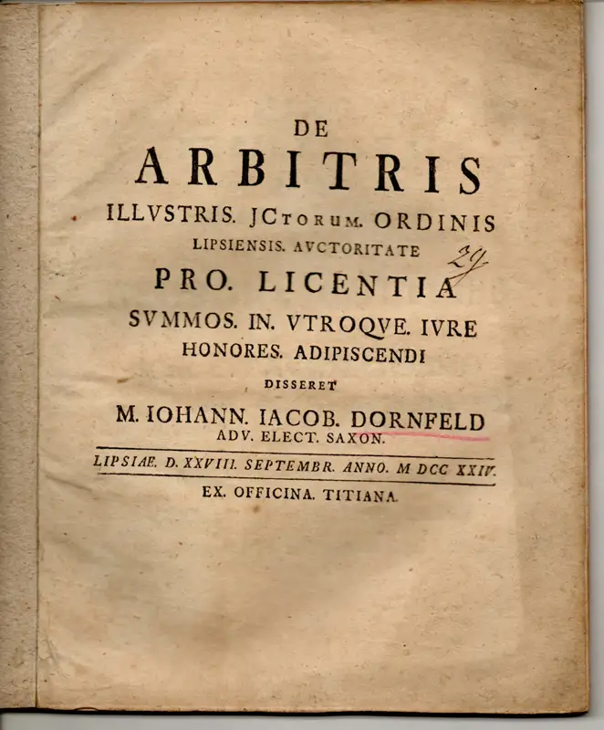 Dornfeld, Johann Jacob: Juristische Disputation. De arbitris.