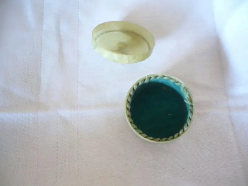 Dose aus Bakelit mit Zierknauf - innen mit samtigen Stoff ausgeschlagen am Rand geflochtene Kordel