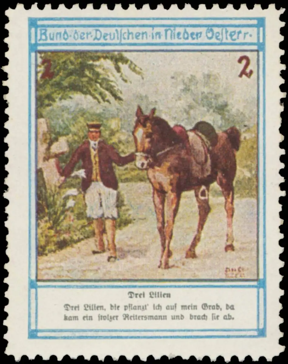 Drei Lilien die planzt ich auf mein Grab, da kam ein stolzer Reitersmann und brach sie ab. Spendenmarke, Größe/Zustand: 4x3 , guter Zustand, Original alte Reklamemarke die seinerzeit für die Werbung benutzt wurde