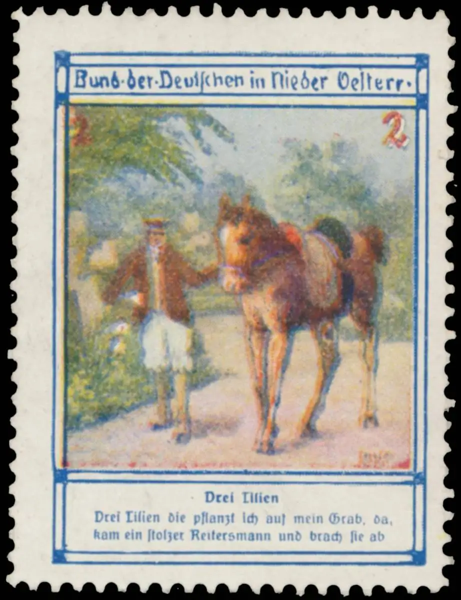Drei Lilien die pflanzt ich auf mein Grab, da kam ein stolzer Reitersmann und brach sie ab. Spendenmarke, Größe/Zustand: 5x4 , guter Zustand, Original alte Reklamemarke die seinerzeit für die Werbung benutzt wurde