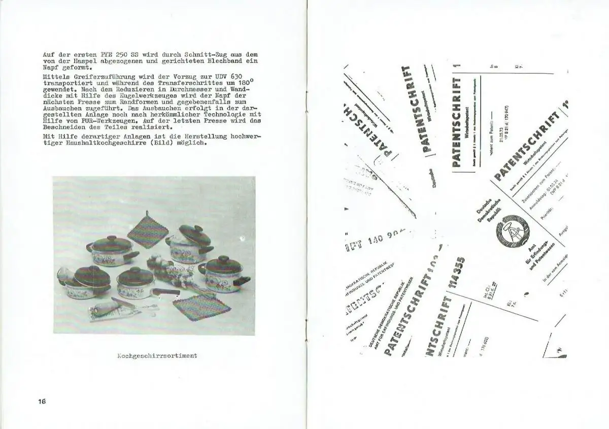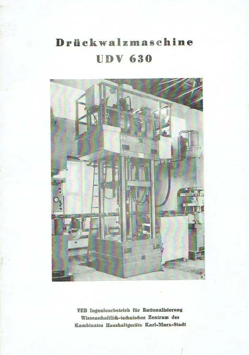sehr guter Zustand, geringe Gebrauchs- und Alterungsspuren, Drückwalzmaschine UDV 630 (technische Daten) - Technologische Möglichkeiten der UDV 630 - Zu- und Abführeinrichtung für UDV 630 - Einsatz der UDV 630 in verketteten Anlagen - Patentberühmung und Veröffentlichungen, kartoniert, ca. 21 x 29,5, 23 Seiten mit 23 Bildern