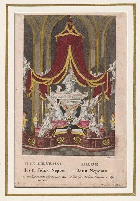 Bemerkungen: Dargestellt ist das silberne Hochgrab des Brückenheiligen Johannes von Nepomuk (1350-1393) im Prager Veitsdom, das 1733-1736 nach Entwürfen von Joseph Emanuel Fischer von Erlach geschaffen wurde. Johannes von Nepomuk erlitt sein Martyrium, indem er in die Moldau geworfen wurde. Vorangegangen war eine Auseinandersetzung mit König Wenzel und dem Prager Erzbischof Jenzenstein. Der Gedenktag der Heiligen Johannes von Nepomuk ist der 20. März.