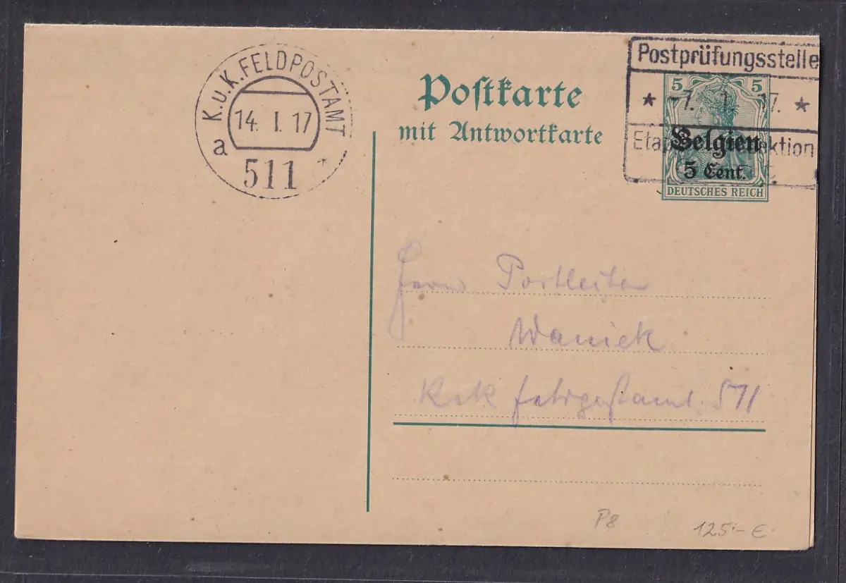Dt. Besetzung 1. WK. Belgien, Ganzsache Mi.-Nr. P 8 gestempelt.