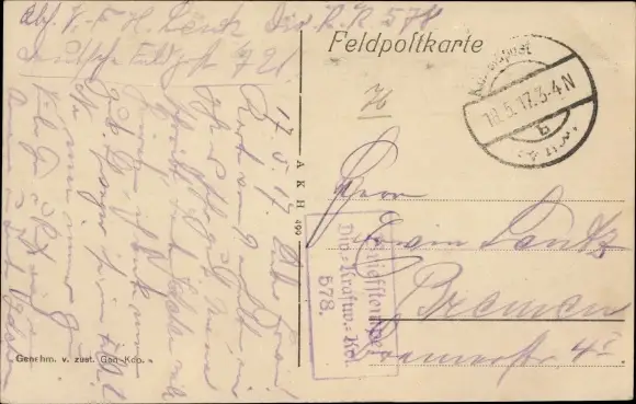 Dt. Feldpost, Div. Kraftw. Komp. 578, I WK, Truppenstempel