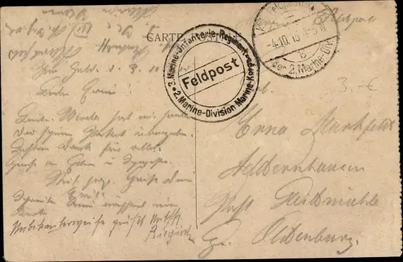 Dt. Feldpost, Truppenstempel, 3. Marine Inf. Regt., 2. Marine Division Marine Korps, I WK