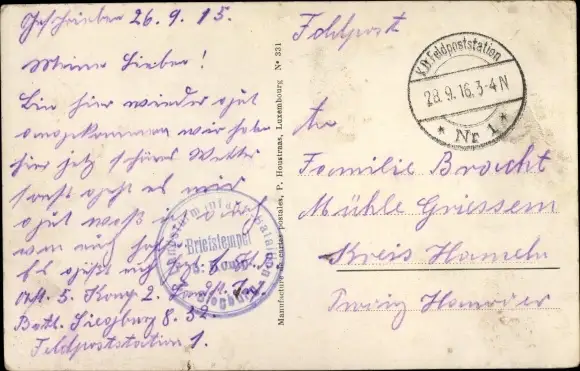 Dt. Feldpost, Truppenstempel, Feldpoststation Nr. 1, 2. Landsturm Batl. Siegburg, 5. Komp., I WK