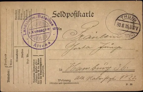 Dt. Feldpost, Truppenstempel, Landsturm Batl. II, 1. Kompagnie Altona, Thuin, I WK