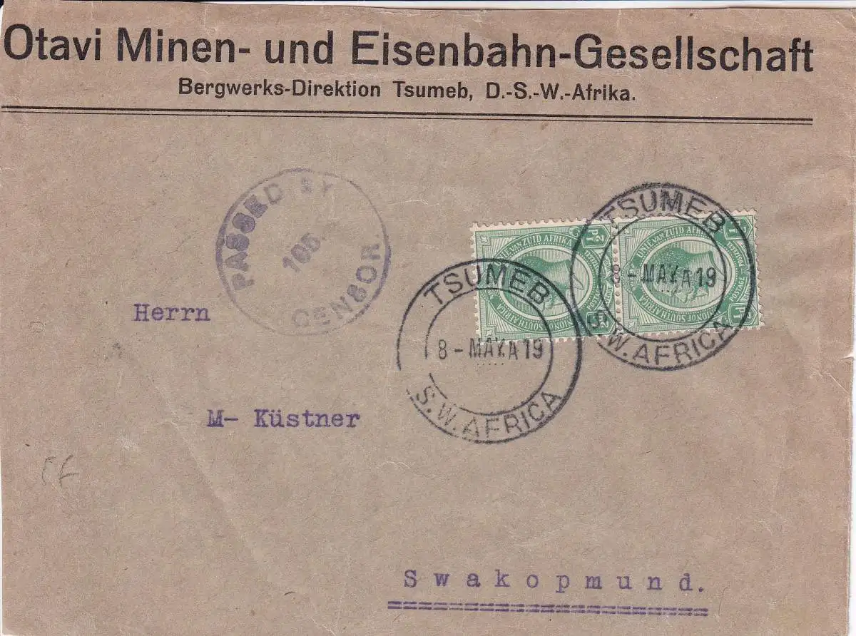 1919 südafrikan. Besatzung KGV 1/2d/ Mi 1 PAAR VORDERSEITE TSUMEB-SWAKOPMUND ZENSUR