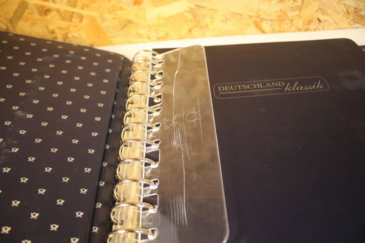 leerer gut erhaltener Vordruck mit Gebrauchsspuren, mit Taschen, inkl. Binder, Blattheber defekt
