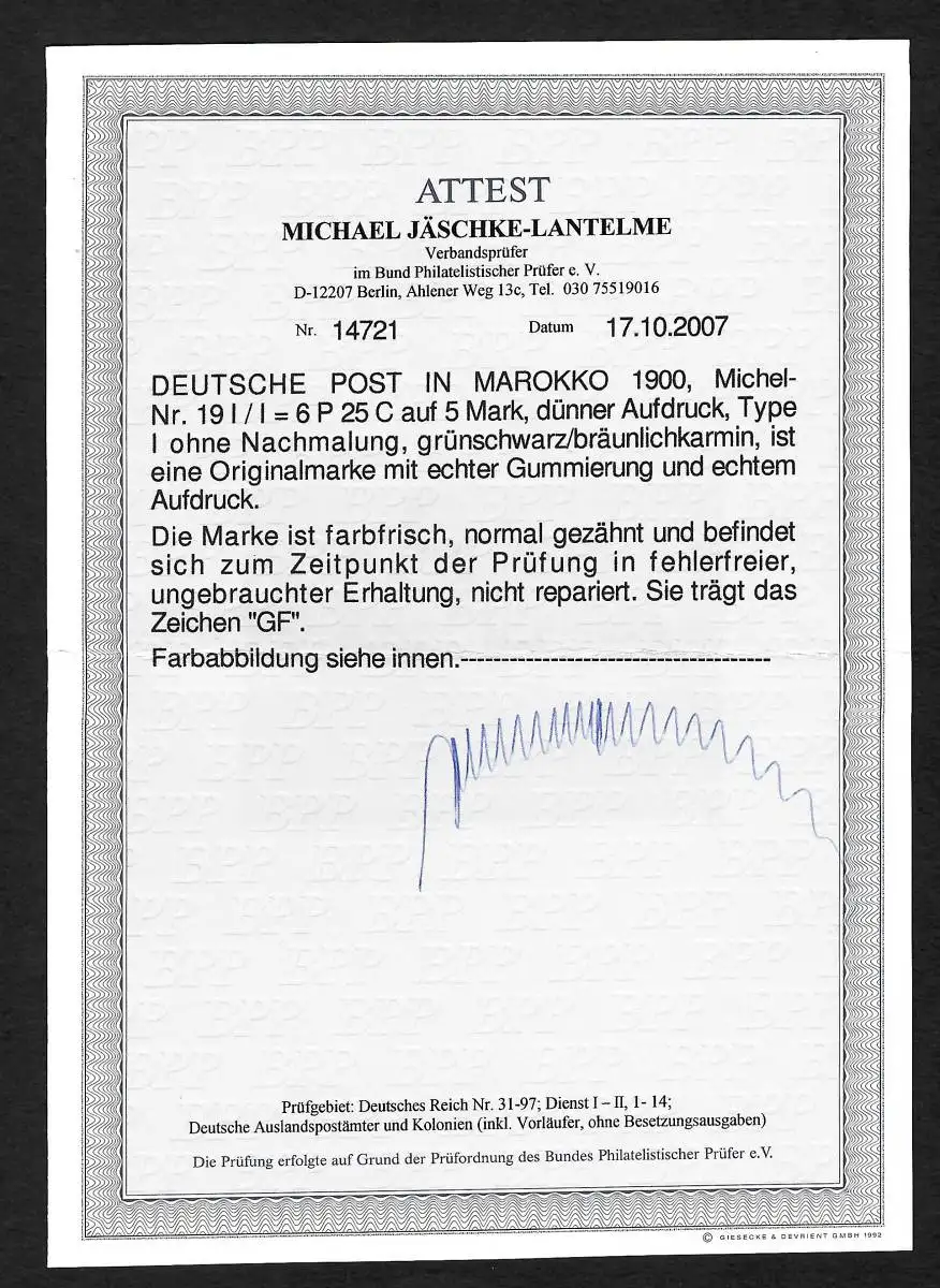 Dt. Post Marokko: MiNr. 19 I/I, dünner Aufdruck, ungebraucht, BPP Attest