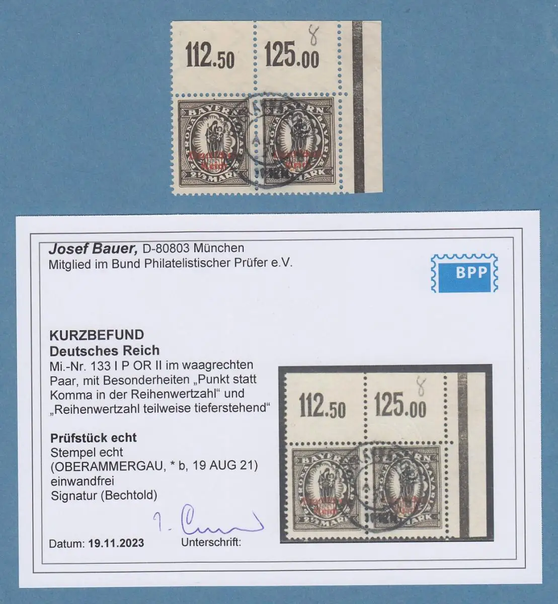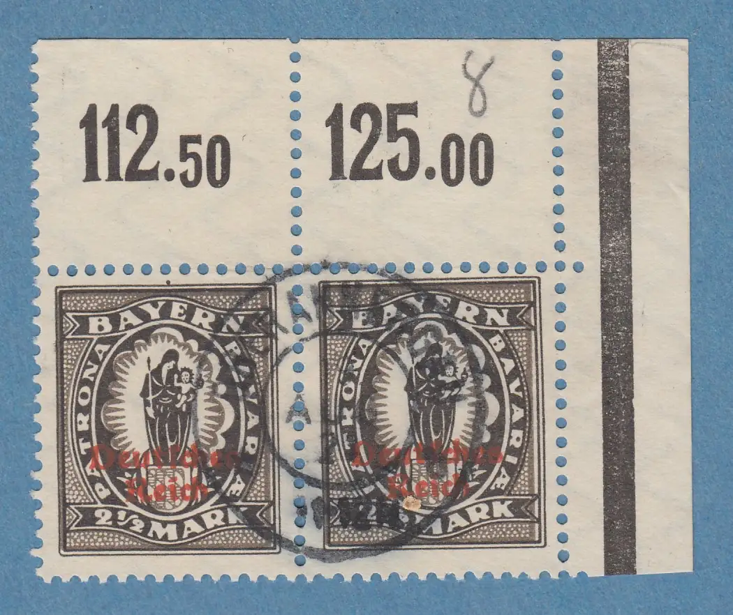 Dt.Reich Bayern Abschied Mi.-Nr 133 I POR II Punkt statt Komma Eckrandpaar O