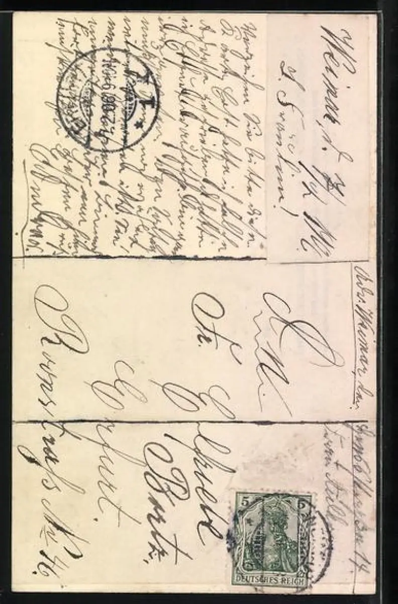 Personenbezogene Daten auf der Rückseite der Karte wurden durch blauen Textmarker unkenntlich gemacht. Die blauen Stellen sind auf die Vorderseite durchgeweicht und wirken sich negativ auf das Postkartenfoto aus