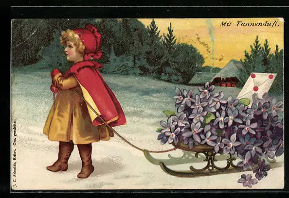 Duft-AK Mädchen mit Schlitten voller Veilchen, mit Tannenduft