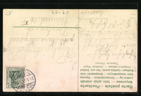 Personenbezogene Daten auf der Rückseite der Karte wurden durch blauen Textmarker unkenntlich gemacht. Die blauen Stellen sind auf die Vorderseite durchgeweicht und wirken sich negativ auf das Postkartenfoto aus