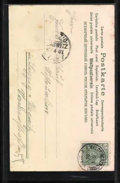 alte Ansichtskarte, gelaufen 1901, minimaler Einriss re. mittig, guter Zustand