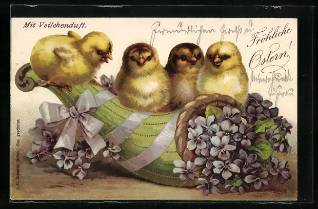 Duft-AK Osterküken an einem Horn mit Veilchen, Ostergruss