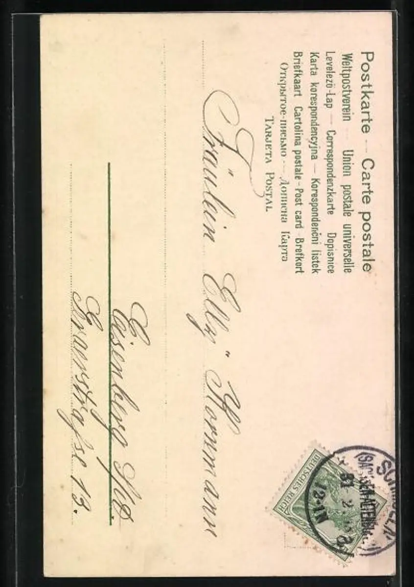 Personenbezogene Daten auf der Rückseite der Karte wurden durch blauen Textmarker unkenntlich gemacht. Die blauen Stellen sind auf die Vorderseite durchgeweicht und wirken sich negativ auf das Postkartenfoto aus