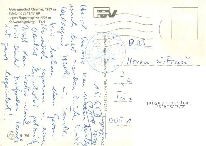 Eben_Achensee Alpengasthof Gramai gegen Rappenspitze Karwendelgebirge Eben Achensee postalisch gelaufen 1987 Erhaltung siehe scans [FriedD77] Frierer