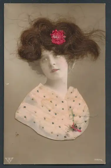 Echt-Haar-AK Frau mit Blume im brünetten gewellten Haar