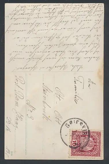 Personenbezogene Daten auf der Rückseite der Karte wurden durch blauen Textmarker unkenntlich gemacht. Die blauen Stellen sind auf die Vorderseite durchgeweicht und wirken sich negativ auf das Postkartenfoto aus