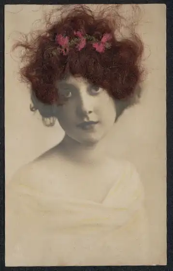 Echt-Haar-AK Junge Frau mit Blumen im Haar