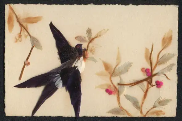 Echtfeder-AK Ein Vogel an einem Beerenstrauch, aus echten Federn
