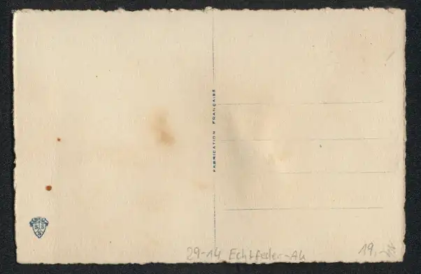 Personenbezogene Daten auf der Rückseite der Karte wurden durch blauen Textmarker unkenntlich gemacht. Die blauen Stellen sind auf die Vorderseite durchgeweicht und wirken sich negativ auf das Postkartenfoto aus