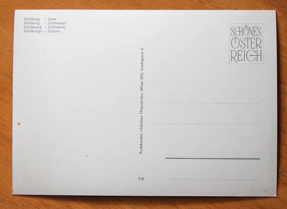 Motiv: Dom hinter dem Residenzbrunnen auf dem Platz im Norden der Kirche. Künstler: keine Angabe. Verlagsangaben: Wien, Farbkarten „Schönes Österreich“, 1960er, 5/8.