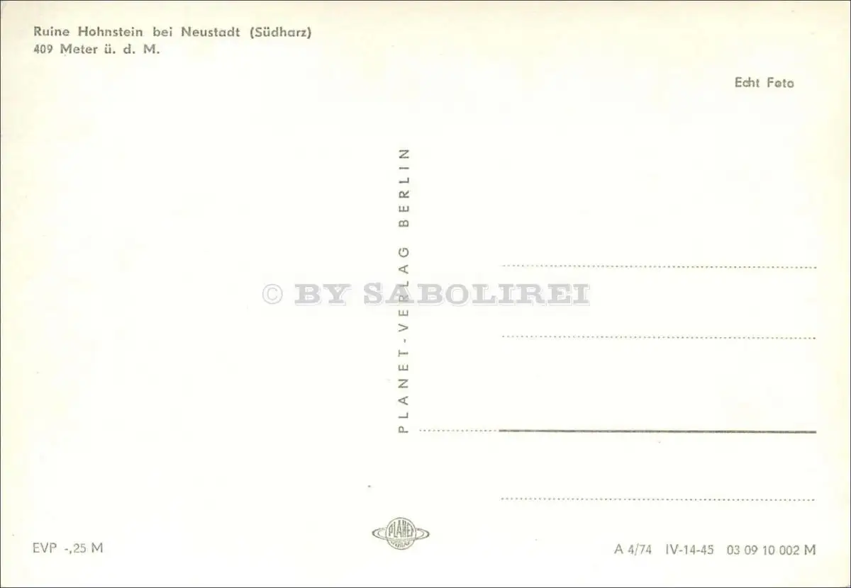 Motiv: Ruine Hohnstein bei Neustadt (Südharz), 409 Meter ü. d. M. Verlagsangaben: Berlin, Planet-Verlag Berlin, 1974, 03 09 10 002.
