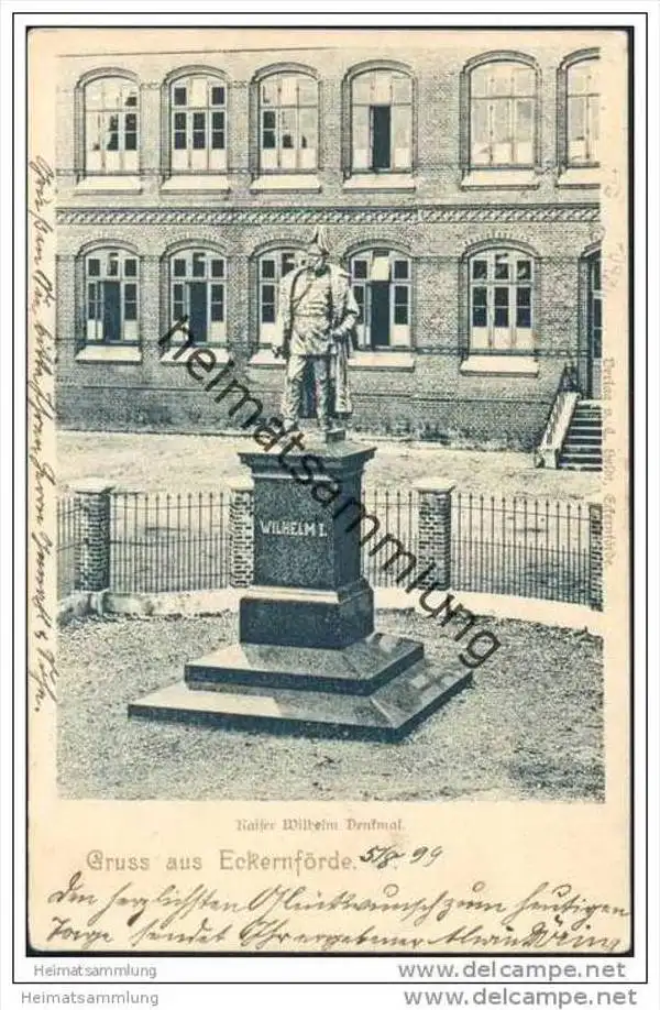 Eckernförde - Kaiser Wilhelm Denkmal - Verlag C. Heldt Eckernförde - Bahnpost Kiel Flensburg Zug 8 (E39458) gel. 1899