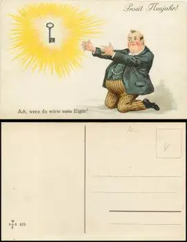 Neujahrskarte Ehe-Humor mit Schlüssel, farbig, * ca.1920