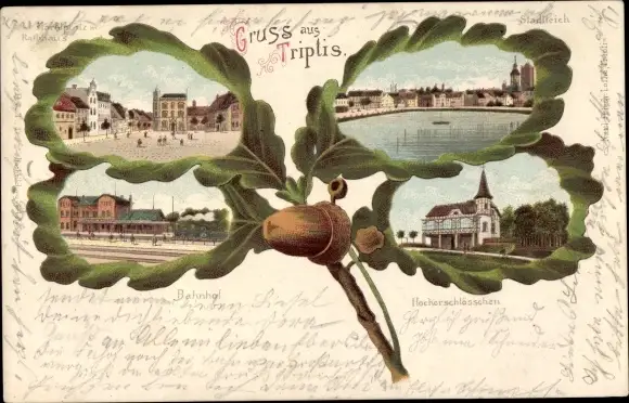 Eichenblatt Litho Triptis in Thüringen, Bahnhof, Marktplatz, Rathaus, Stadtteich, Hockerschlösschen