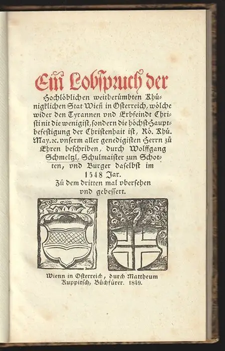 Wien, Kuppitsch 1849. Zu dem dritten mal ubersehen und gebessert. (Neudruck). kl.-8°. 40 Bll. Tit. in Rot und Schwarz gedruckt mit 2 Wappenholzschn. Pbd.. d. Zt. m. Rückensch. In sehr gutem Zustadn.