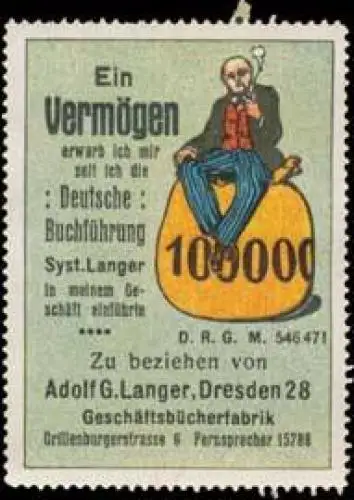erwarb ich mir seit ich die Deutsche Buchführung System Langer in meinem Geschäft einführte. Geld, Größe/Zustand: 6x5 , guter Zustand, Original alte Reklamemarke die seinerzeit für die Werbung benutzt wurde