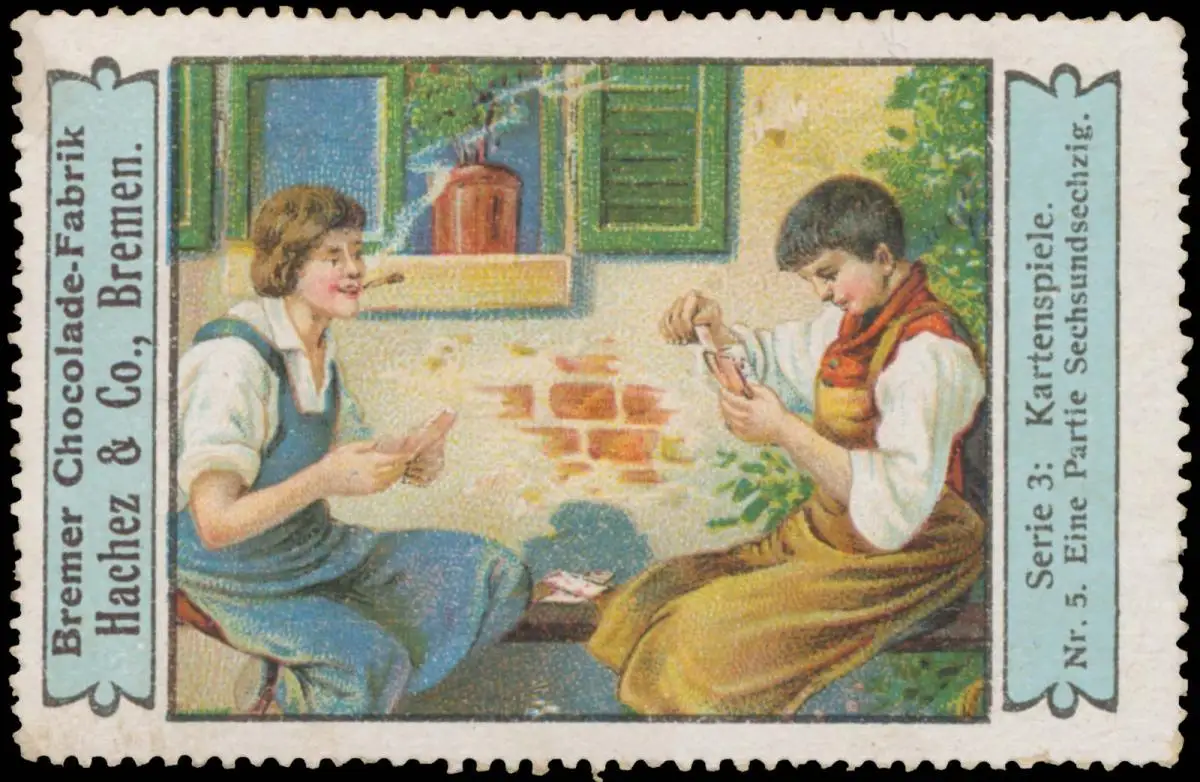Serie 3: Kartenspiele, Nr. 5, Schokolade, Größe/Zustand: 5x7 , fleckig, Original alte Reklamemarke die seinerzeit für die Werbung benutzt wurde