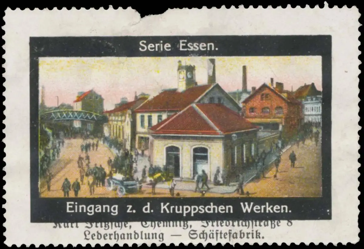 Krupp, Serie Essen, Lederhandlung, Stärkefabrik, Friedrichstraße 8, Größe/Zustand: 5x7 , beschädigt, Original alte Reklamemarke die seinerzeit für die Werbung benutzt wurde