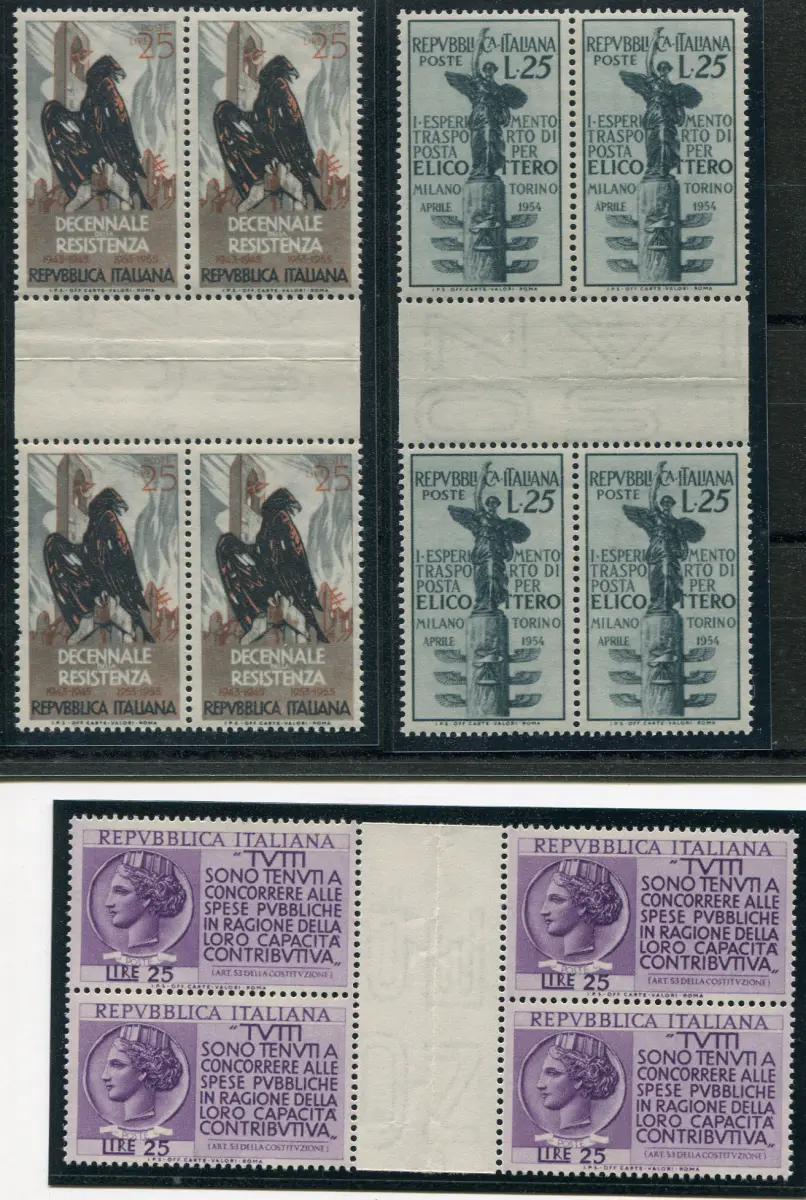Einkommen, Hubschrauber und Widerstand mit Vollgummi-Zwischenraum - MHN - - Einkommen, Hubschrauber und Widerstand (Nr. 737, 738, 739) drei Werte im Viererblock getrennt in der Mitte durch Gruppenzwischenraum - Kat. euro 60 Cod. 357/14