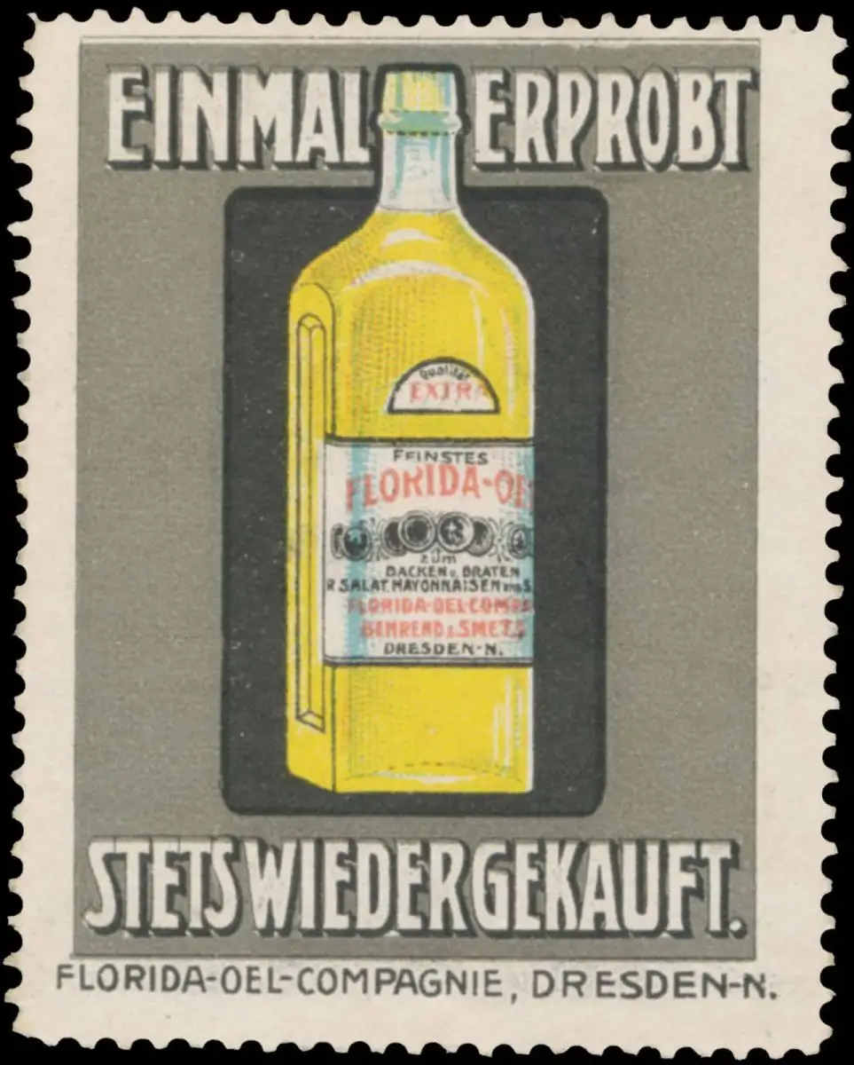 Florida-Oel, feinstes Speiseoel, Größe/Zustand: 5x4 , guter Zustand, Original alte Reklamemarke die seinerzeit für die Werbung benutzt wurde