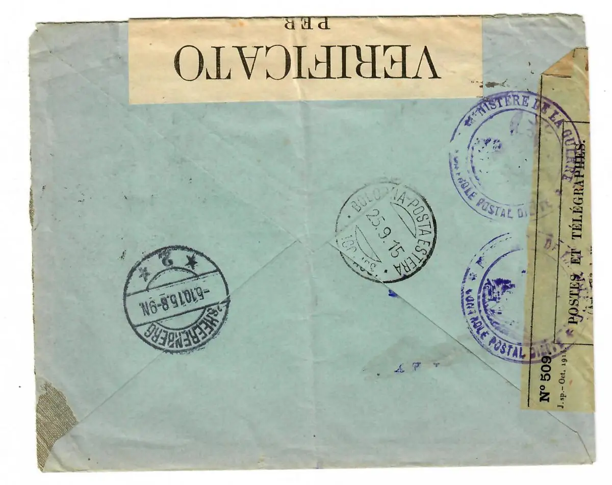 Einschreiben Como/Bologna nach Herrenberg, 2x Zensur 1915