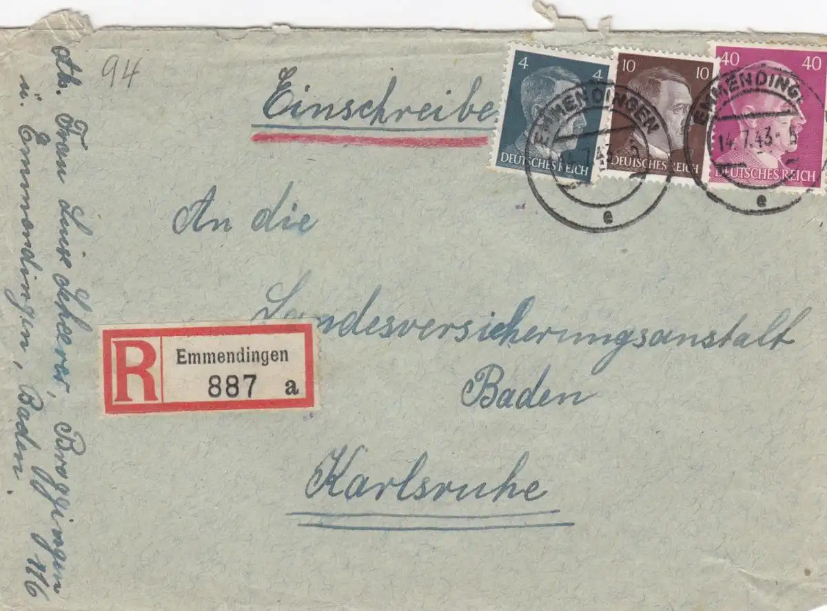 Einschreiben Emmendingen 1943 nach Karlsruhe